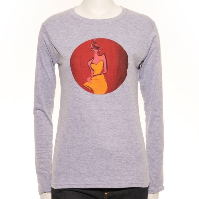 Light gray long sleeve t-shirt with red, orange, and yellow circular graphic.