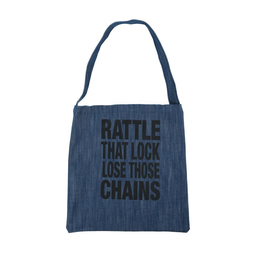 David Gilmour dark blue denim tote bag with black "Rattle That Lock Lose Those Chains" print on the front.